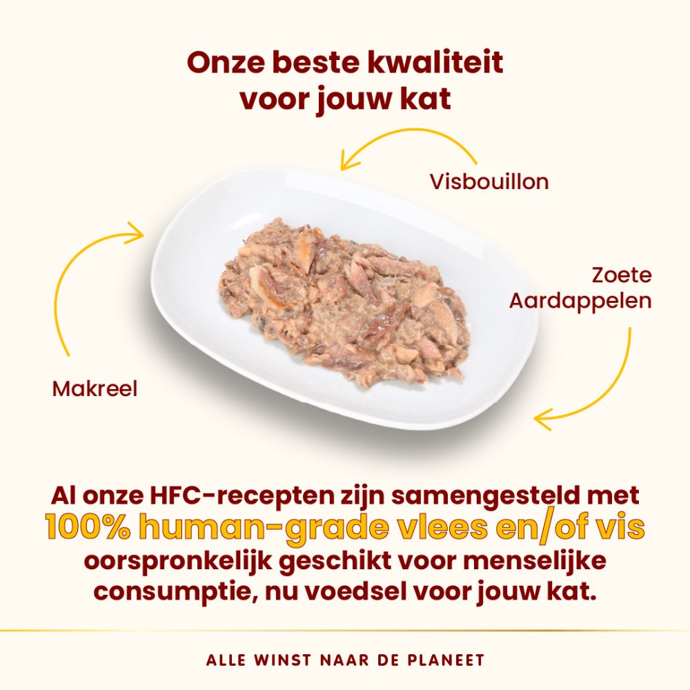 Makrele mit Süßkartoffel: Rohprotein 12 %, Rohfaser 0,5 %, Rohfett 3 %, Rohasche 1,5 %, Feuchtigkeit 83 %, Calcium 0,3 %, Phosphor 0,3 %, Energie 749 kcal/kg