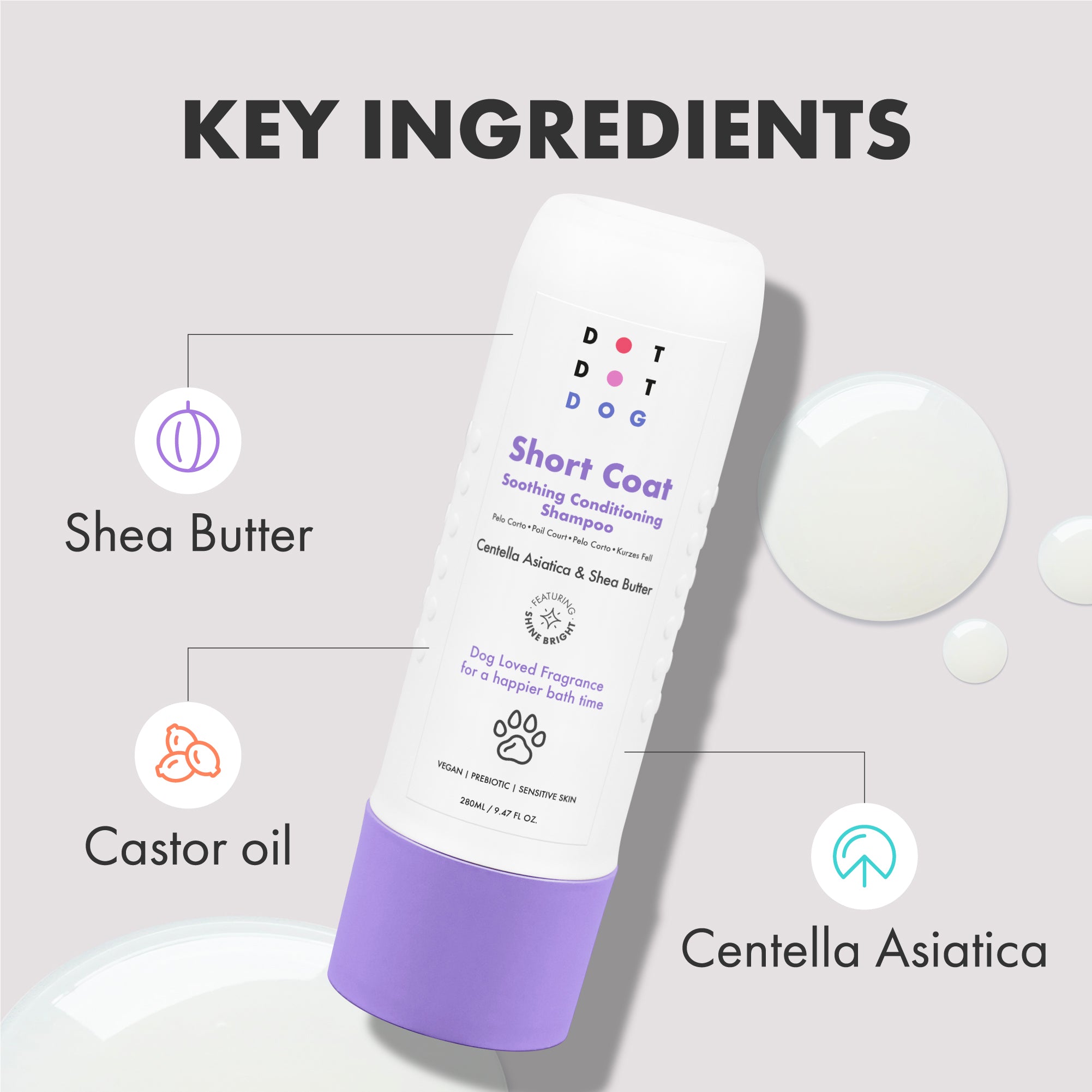 Auch kurzes Fell braucht Pflege – dieses Shampoo ist mit Centella Asiatica und Sheabutter angereichert, um empfindliche Haut zu beruhigen und das Fell zu pflegen. Perfekt für Hunde, die nach einem Spaziergang im Schlamm oder einer aktiven Spielrunde regelmäßig gebadet werden müssen.
