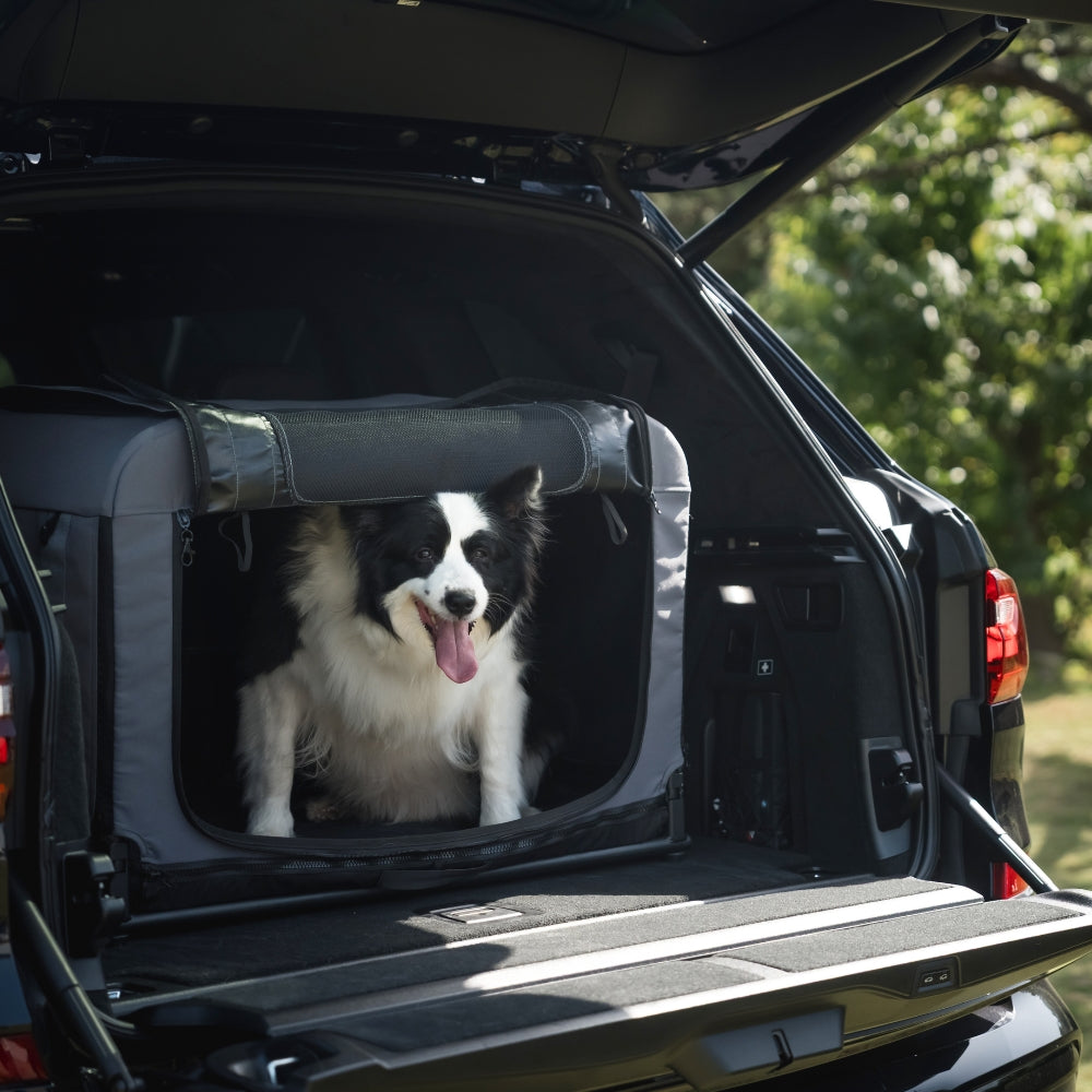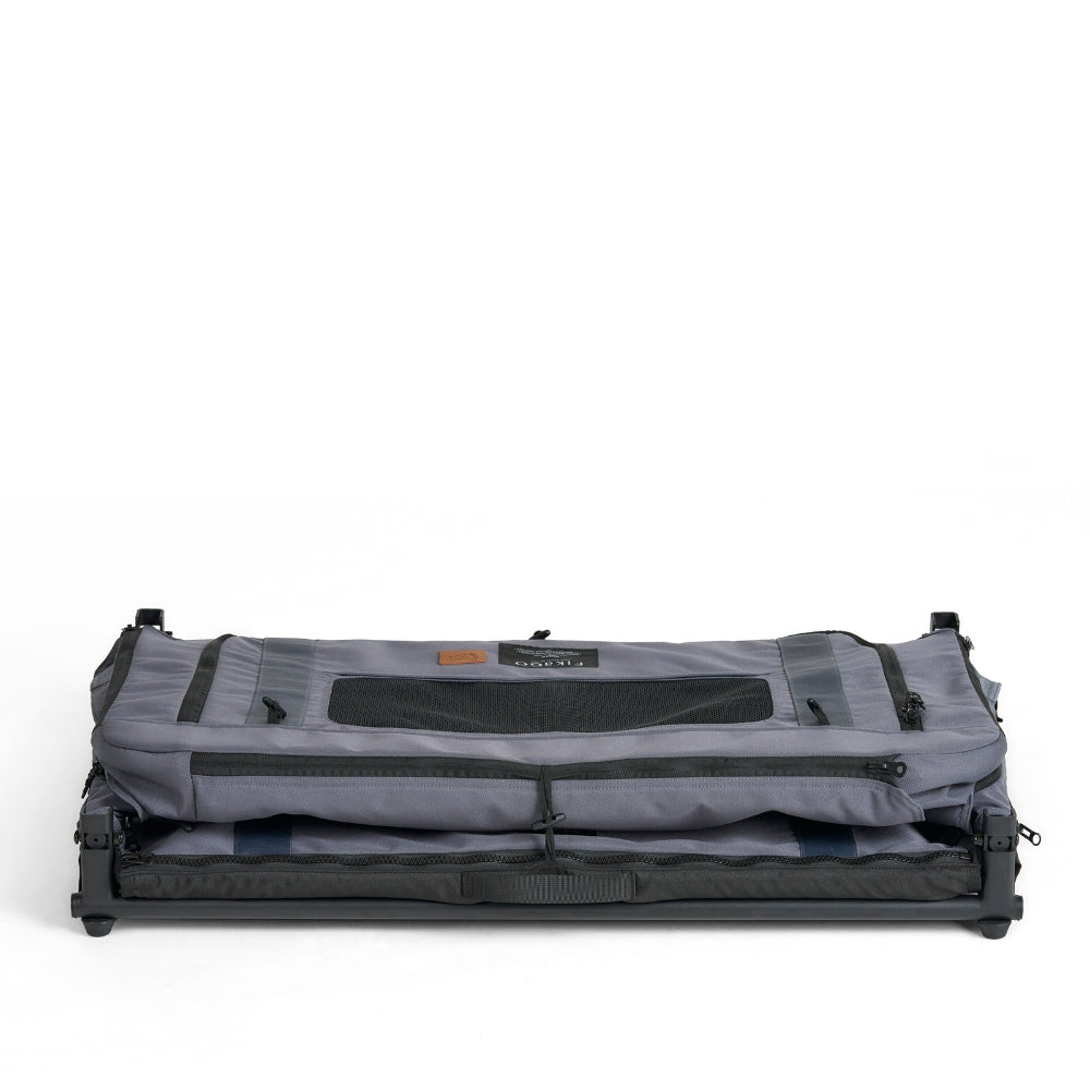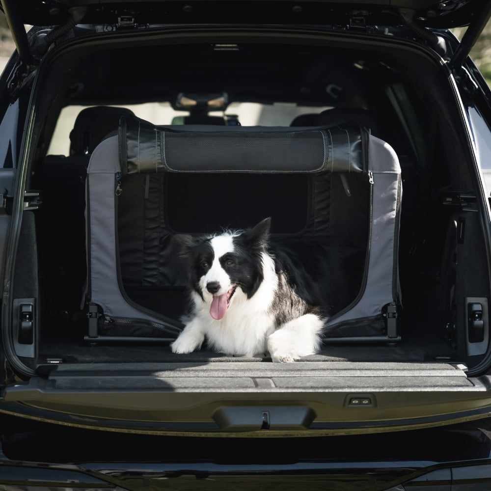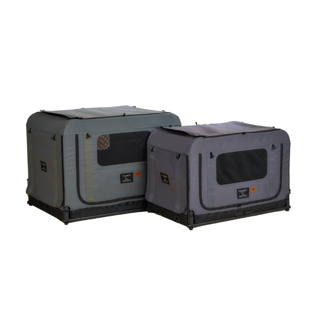 The Queen is available in sizes S (up to 30 kg) and M (up to 50 kg), and in grey and green. Thanks to its aluminum frame and durable materials, the kennel remains sturdy, while its lightweight design and foldable construction make for easy transport and storage.