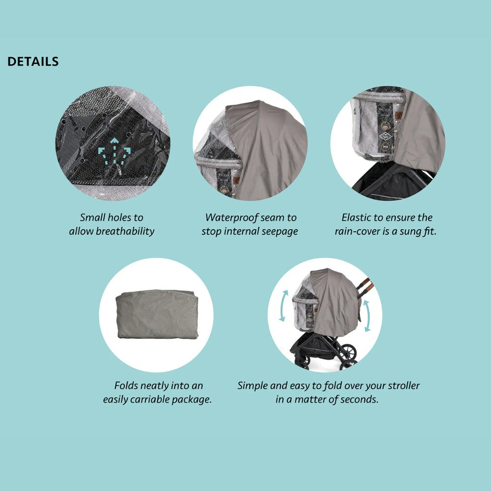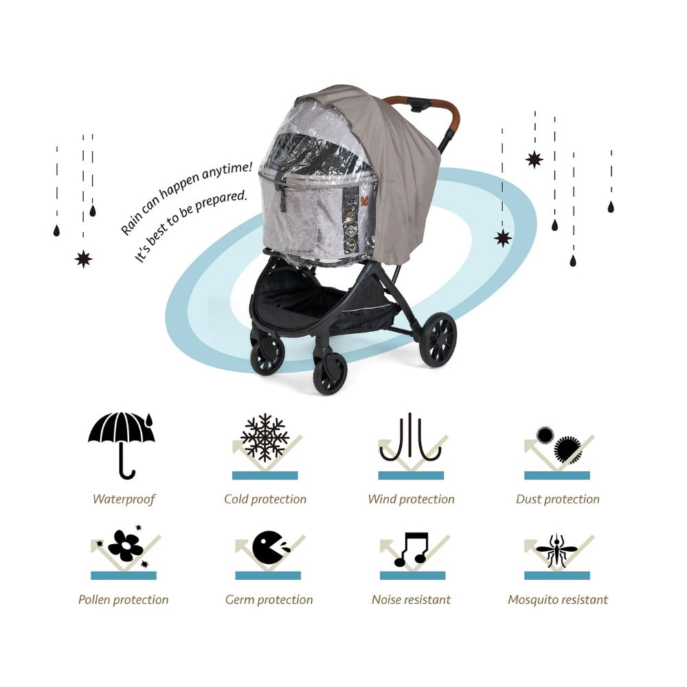 Designed for comfort and safety, this cover protects not only against rain but also against cold, wind, pollen, dirt, and even insects. Thanks to the transparent, waterproof PVC panels and breathable ventilation window, air circulation is maintained, ensuring a pleasant climate in the stroller, even in wet weather.
