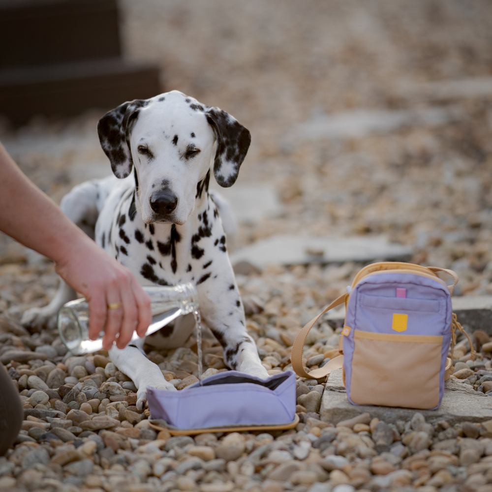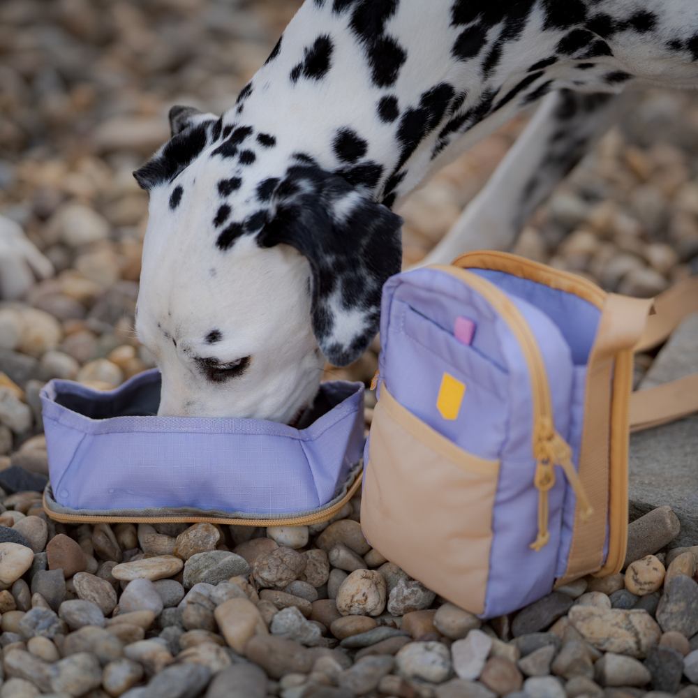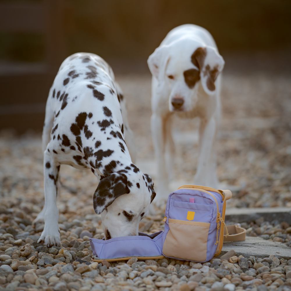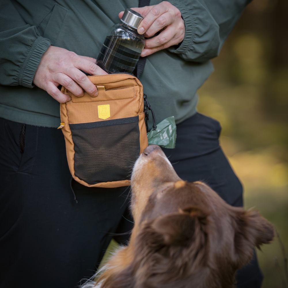 De tas is vervaardigd uit 100% gerecycled polyester ripstop (RPET), afkomstig van gerecyclede PET-flessen. Het ruime hoofdvak met dubbele rits biedt plaats aan dagelijkse benodigdheden en beschikt over een geïntegreerd poepzakjesvak met discrete uitgang. Tussen de twee compartimenten bevindt zich een verstelbare houder voor diverse maten waterflessen. De achterzijde kan worden losgemaakt en gebruikt als drinkbak voor de hond, waardoor hydratatie onderweg eenvoudig wordt.