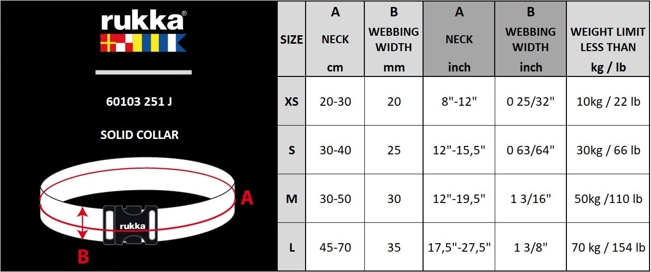 Rukka Solid halsbanden hebben een maat die varieert van XS tot L. Om de juiste maat te bepalen, moet de omtrek van de nek van de hond gemeten worden op het breedste deel van de nek. Bovendien vermelden de maattabellen de breedte van elke halsband en staat daarbij het gewicht van de hond aangegeven. De halsband is op de juiste maat bij de hond stellen met de verstelbare schuif.